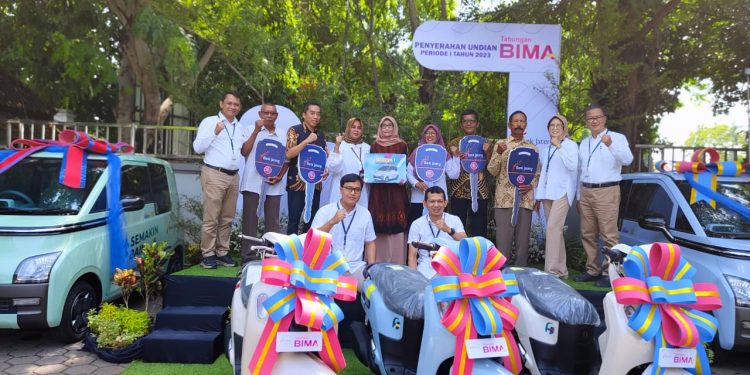 LENTERAJATENG, PATI — Bank Jateng Cabang Koordinator Pati melaksanakan penyerahan Hadiah Undian Bima Periode 1 Tahun 2023. Sejumlah hadiah yang diberikan kepada nasabah tersebut berupa satu unit mobil Wuling Air EV dan lima unit sepeda motor Fazzio Hybrid, Selasa (9/1/2024).