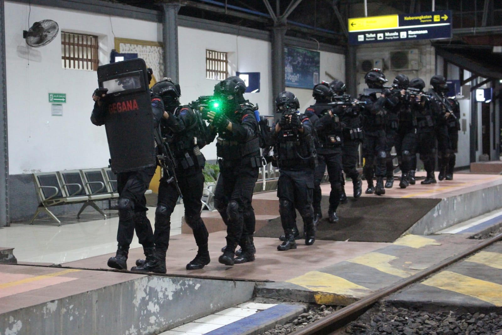Latihan dengan suara dari baku tembak dan ledakan seakan menggambarkan situasi seperti kejadian nyata. Kemudian tim penanggulangan Kimia Biologi dan Radioaktif (KBR)/Den Gegana juga mengamankan barang berisi gas beracun di dalam gerbong.