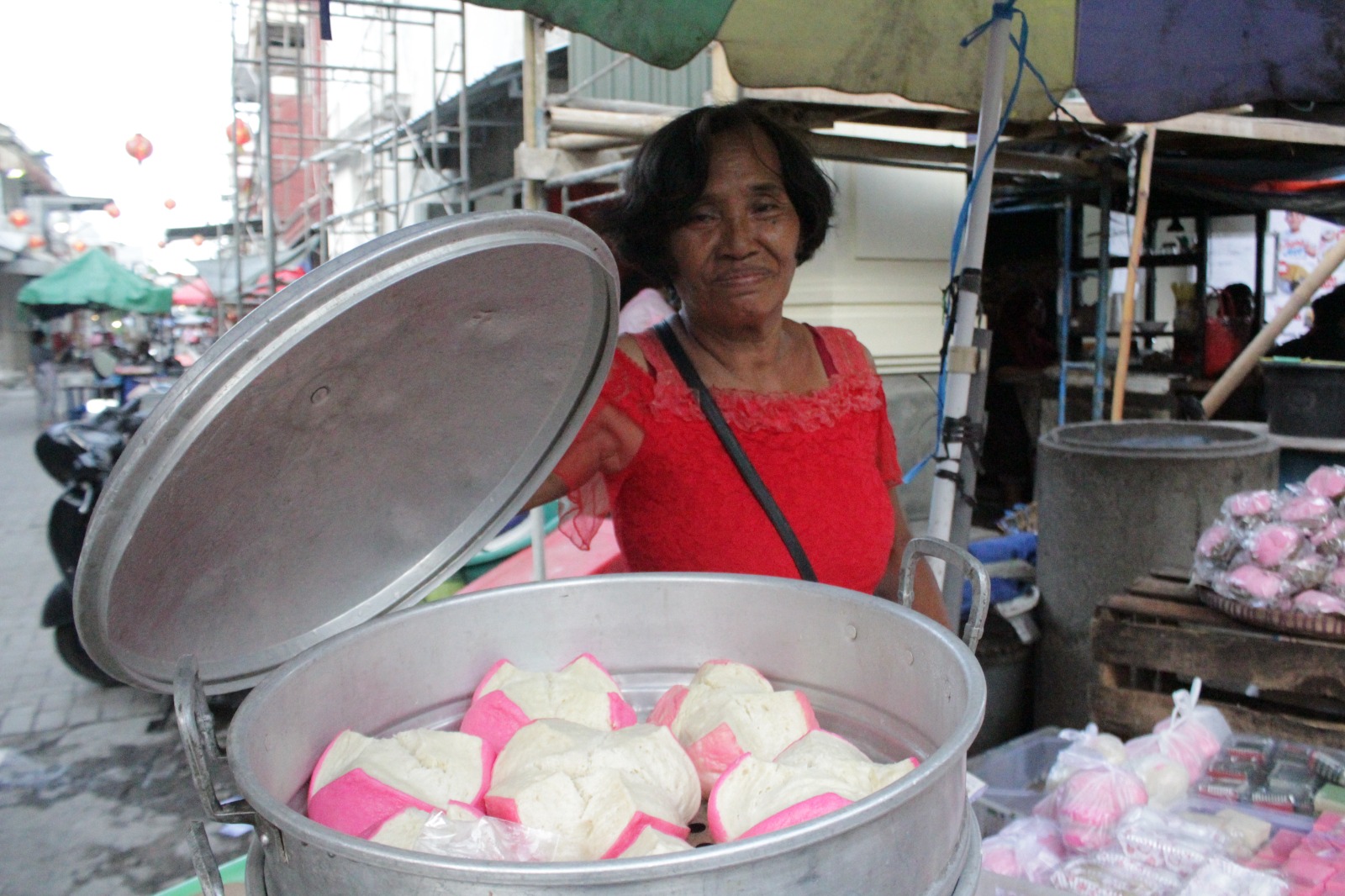 LENTERAJATENG, Semarang – Uap panas seketika mengepul ketika tutup panci kukus dibuka. Di dalamnya, barisan kue berwarna merah muda berjajar memikat mata.