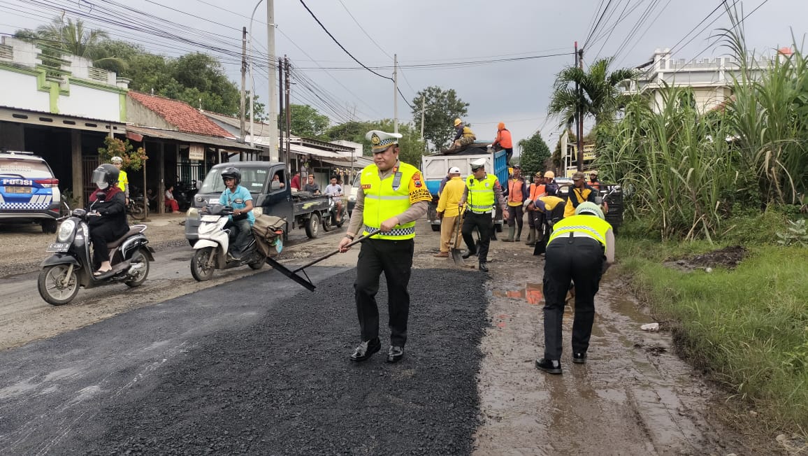 Tak hanya memberikan penyuluhan melalui pembagian selebaran, petugas kepolisian juga terjun langsung membantu perbaikan jalan berlubang di Jalan Raya Bojong, Kabupaten Pekalongan.